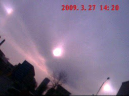 Internet user told the newspaper Secreat China: "In the city of Laiyang, Shandong Province on 27 March 2009 approximately 16:20 to 16:50 hours in the sky the sun appears three, on both sides of the front of the sun, there are two light-rounded a blind uncertain, as the sun hidden behind clouds, in the East rainbow appears as a very large bow.